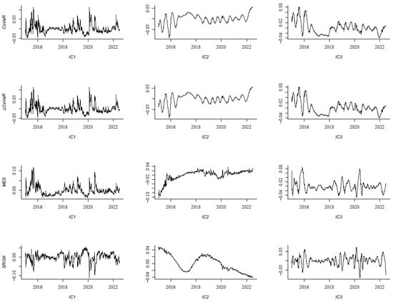 Compared to IC2, IC3 has a trend similar to the corresponding original sequence, but it is relatively smooth, with significant changes during important financial shocks. Therefore, IC2 can be interpreted as the impact of other factors on the variation of systemic financial risk, while IC3 can be interpreted as the impact of financial shocks on systemic financial risk. During the “stock market crash” in 2015, the China–US trade friction in 2018, and the COVID-19 pandemic in 2020, IC3 showed varying degrees of changes.