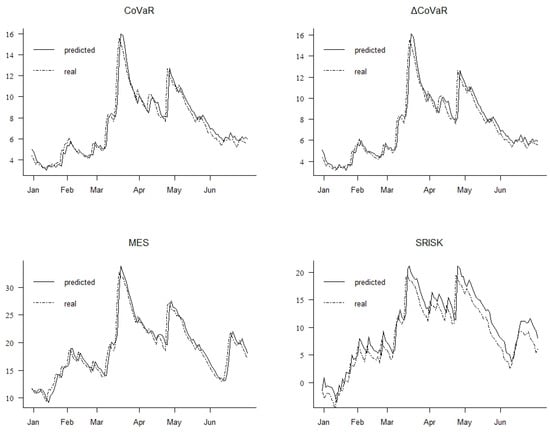Since the stock market operates 5 days a week, a forward-looking 5-step prediction was selected. SIMF and the network public opinion index were used as outputs. After passing through the BiLSTM-Attention network, the results were integrated to obtain the predicted values of systemic financial risk. Figure 10 shows the changes in the predicted values and real values of CoVaR, ∆CoVaR, MES, and SRISK from January to June 2022. Among them, the deviation of SRISK is larger than the other three indicators, but overall, the ESMD-HFastICA-BiLSTM-Attention model can predict the changing trend of systemic financial risk well.
