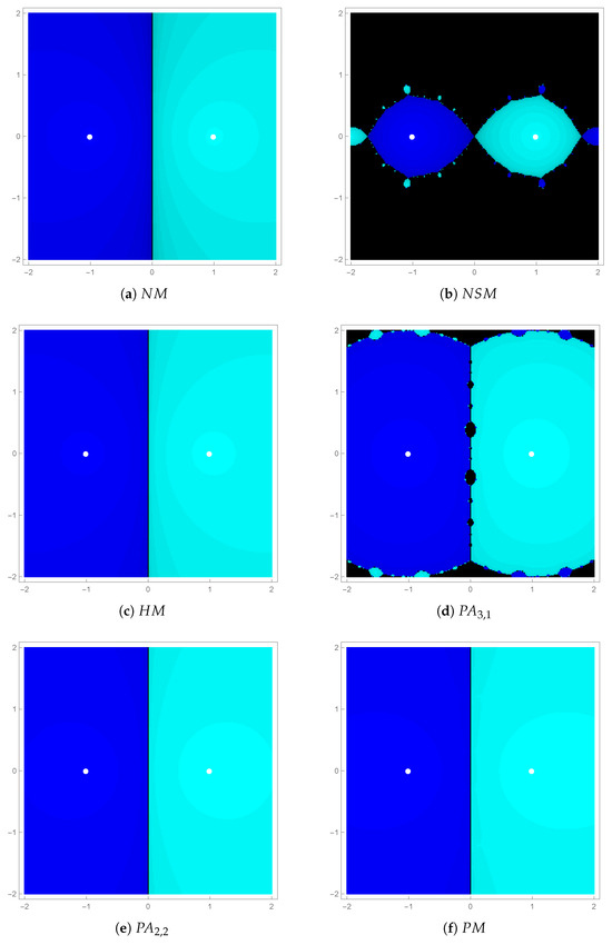 Figure 1 illustrates the basins for (5), (11), (12), (10), and the proposed method (18). It is evident from Figure 1b,d that methods and exhibit local convergence, while the other methods exhibit the global convergence. Moreover, Figure 1e,f illustarte broader and lighter basins of attraction because of higher convergence order of and as compared to the basins of and as shown in Figure 1a,c. One can notice the symmetry in convergence region of each method. The convergence regions are symmetric about imaginary axis.