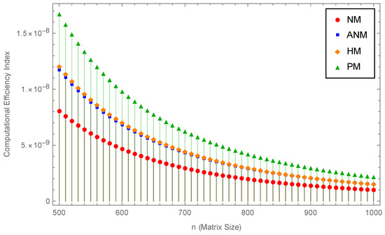 The approximate cost of matrix multiplications in current programming packages is [29]. For a matrix of size n, we therefore consider that the cost of one matrix-matrix multiplication is and cost of one matrix inverse is . Additionally, we do not take into account the cost per iteration of norm computation (in (6)), addition and subtraction. Then, ’s for the methods (5), (6), (12) and (18) to compute are given in Table 1.