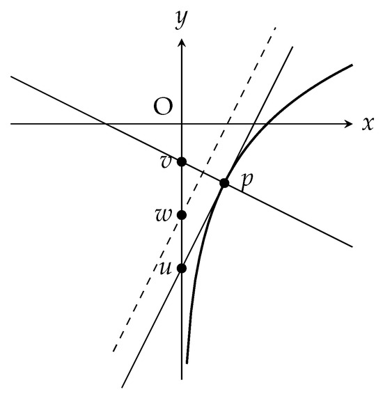 Consider the graph of the function defined by for . Then, the tangent line of the curve at the point on the graph intersects with the y-axis at , and the normal line at p intersects with the y-axis at . The midpoint of u and v is ; see Figure 1.