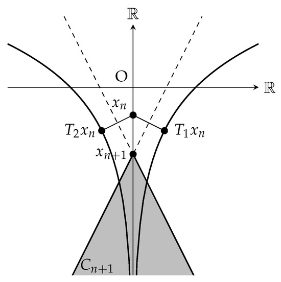 respectively. If the initial point lies on the y-axis and we generate the sequence by the scheme in Theorem 3, then, by symmetry, every will be on y-axis if it is defined. Now, we assume that are defined and lie on the y-axis with descent order; lies below for . Let