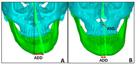Pre-surgical CT images from two subjects were used to computerize the midface (black) and mandible (green) optimal symmetry plane (OSP). The OSP is a computer-generated voxel-based median plane. Anterior deviation distance (ADD) is the distance between the midface OSP and the lowest point of the mandible OSP, measured in millimeters [,]. (A) a patient with mandible deviation to the left, with ANS coinciding with the mid-sagittal reference plane (midface OSP); (B) a patient with mandible deviation and ANS deviation to the left side.