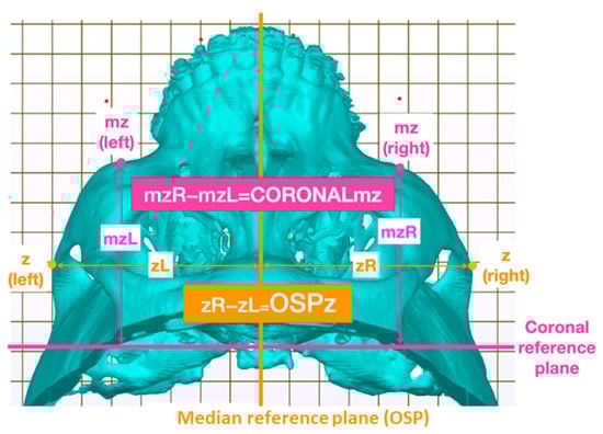 The measurements and outcomes of midface landmarks. z: zygion, marked by orange points; mz: maxillozygion, marked by pink points. The distance from the left mz point to the coronal reference plane subtracted from the distance from the right mz point to the coronal reference plane is represented as CORONALmz. The distances from the right and left z points to the OSP were measured. Based on the same rationale, the distance from the left z point to the OSP subtracted from the distance from the right is represented as OSPz. OSP: optimal symmetry plane.