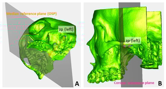 Measurements of bilateral zp landmarks in lateral and anteroposterior directions. (A) The distance from the left zp points to the median reference plane (midface OSP); and (B) the distance from the left zp points to the coronal reference plane. zp: the highest point on the curve of the zygomatic process at the temporomandibular joint from the lateral view, marked by the purple point. OSP: optimal symmetry plane.