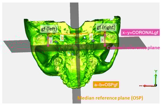 Measurements of bilateral gf landmarks. OSPgf is the distance from the left gf point to OSP subtracted from the distance of the right gf point to OSP. CORONALgf is the distance from the left gf point to the coronal reference plane subtracted from the distance from the right gf point to the coronal reference plane. OSP: optimal symmetry plane; gf: the most medial point of the glenoid fossa identified from the inferior view, marked by red points.