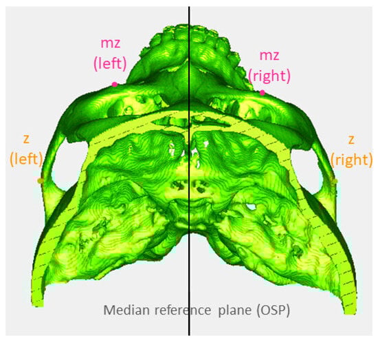 A subject with recognizable asymmetry of the midface. The value of CORONALmz in this patient is −3.45. z: zygion, marked by orange points; mz: maxillozygion, marked by pink points. OSP: optimal symmetry plane.
