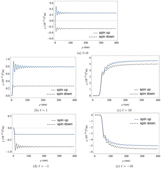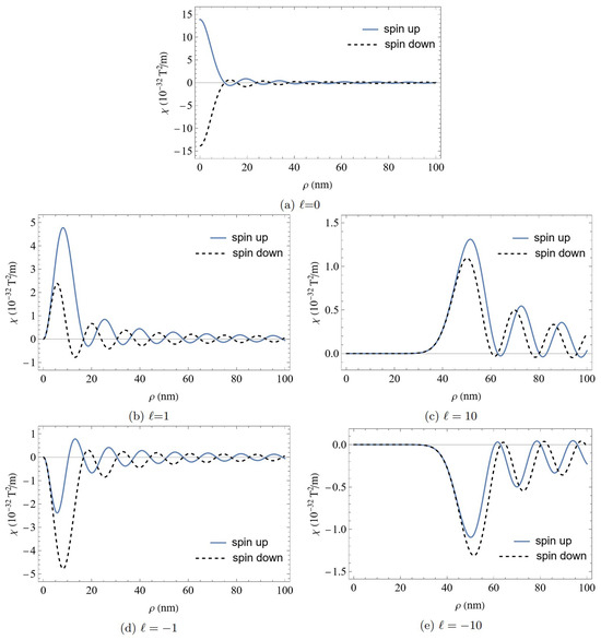 The magnetic helicity density of an infinite relativistic electron Bessel beam with (a) , (b) , (c) , (d) , and (e) . The difference between the magnetic helicity densities of the two spin states is clearly demonstrated. The height of the first peak increases for higher values of ℓ.