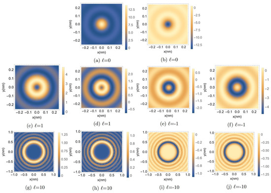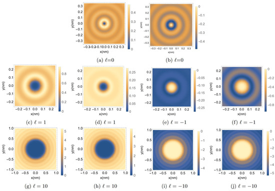 In Figure 2, we see the two-dimensional distribution of the current helicity density, which gives a clearer visualization of the difference between the two spin states. It is also easy to deduce from Figure 2c,e that the distributions of with the same spin value cannot be described as mirror images of each other. The regions of low current helicity density (shown in blue) in Figure 2c replace the high helicity density (bright yellow) of the focal plane; however, their magnitudes are not identical. This is clearly shown in Equation (10), in which the current helicity density relies on the spin states and sign of ℓ. These findings confirm the chiral character of the relativistic electron vortex beam, similar to what has been observed in the case of non-relativistic spin-polarized electron vortex beams [23]. The choice of a lower value of the radial wave vector in this relativistic treatment causes a larger radial spread for all the components of the field, and hence this holds for the current and magnetic helicity densities compared to the non-relativistic case. This is expressed by the multiplication of the radial wave vector and the radial distance in the argument of the Bessel function.
