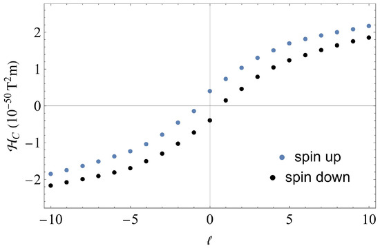 where the integration over gives . Using Mathematica’s Double Exponential Oscillatory numerical integration approach, the total current helicity for each ℓ value was determined for the range to . These results are shown in Figure 3. Interestingly, we find that for , the spin contribution coming from relativistic effects prevents the total helicity from being zero. The outcome is not wholly unexpected because the charge and current distributions, which are what cause all of the physical effects in this work, have a cylindrical symmetry. Therefore, the eigenvalue along the z-axis, rather than the total angular momentum J or OAM ℓ, is what matters in this situation. As the winding number increases, the total current helicity increases for both spin states and is larger in the spin-up state. The difference between the total current helicities of the two opposite spin relativistic vortex beams is not constant and varies slightly as a function of the winding number ℓ.