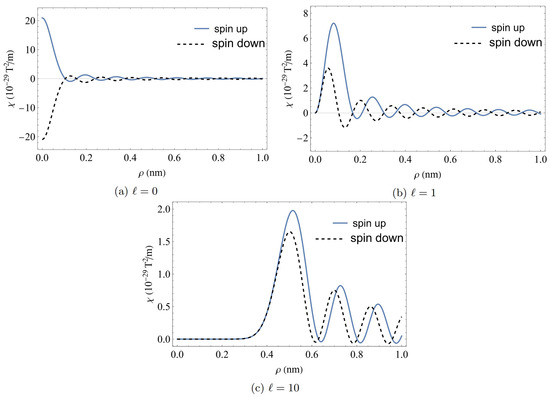 The radial distribution of the current helicity density results for beams of order , and are illustrated in Figure 1. It can be seen that the current helicity density has an oscillating structure similar to that of the magnetic field components. As we increase the winding number, we obtain a lower first peak and diminishing oscillations at longer radial distances . The non-vanishing for the case of is noteworthy here, where the plots for the two different values of s are mirror images with respect to the horizontal axis. The plots for exhibit noticeably different characteristics; for example, the plots (b) (spin-up) and (d) (spin-down) for beams with look symmetrical with respect to the z-axis, and the same holds for . Based on the magnetic field formulas and the Bessel function property , which holds for integer ℓ [31], this indicates that for even ℓ, and for odd ℓ. We infer that for negative winding numbers, both the current helicity density and total current helicity of the spin-up state become opposite to the spin-down-state.