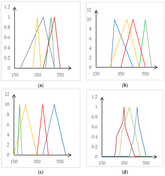 The cuts , of the ‘triangular’ FN with the MF in Form (49) are calculated using the formula . In this example, we use approximate calculations with the number of u-cuts, , being equal to 11. The graphs of the MFs , , are represented in Figure 1a for the alternative , in Figure 1b for , and Figure 1c for . In Figure 1a–c, for each alternative , the MFs , are drawn blue for the state j = 1, yellow for the state j = 2, green for state j = 3, and red for the state j = 4.