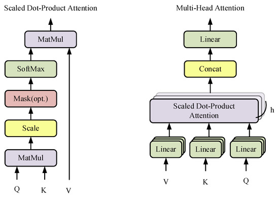 The structure of the scaling dot multiplication attention mechanism is shown in Figure 7. Each word in the text is represented by three vectors: , , and . Multiplying the input vector with different initialized weight matrices yields , , and , as shown in Equations (6) to (8).