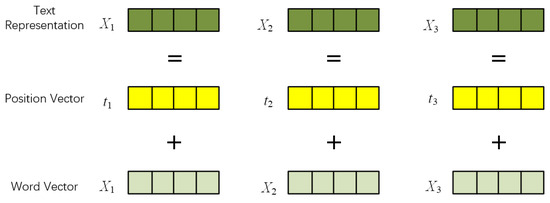 With regards to the self-attention mechanism, it can be seen that it has no structure that captures sequence information, which means that even if the order of a sentence is disrupted, the features captured by the transformer are the same. This is unacceptable for some natural processing tasks. In order to avoid this situation and reflect the positional relationships among words in the text, positional vectors are added to the transformer’s word vector layer, as shown in Figure 8.
