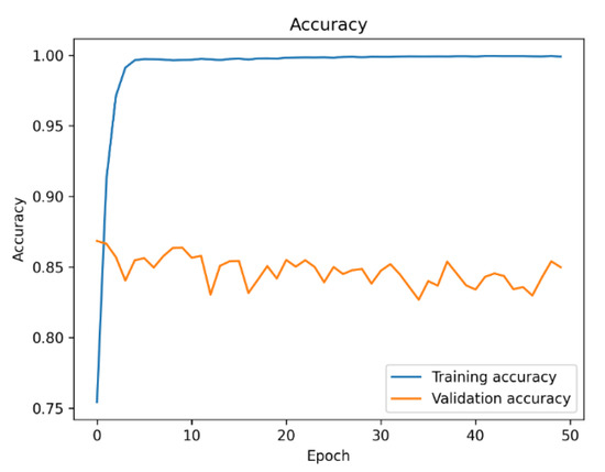 RNNs are specifically designed to process data with temporal characteristics. The output of an RNN’s neurons is not only transmitted to the next layer, but also retains a hidden state, which is passed on to the next neuron until it is changed in subsequent divine elements. This hidden state gives subsequent neurons the opportunity to see the state preserved by previous neurons far away from them; this is very important in text classification as such classification involves a section of a sentence being analyzed. Usually, the subject of the sentence appears at the beginning, and the meaning or verb conveyed by the sentence often appears in the middle. The implicit state of an RNN is conducive to the network identifying the sentences in the later part while connecting these with the subject appearing at the beginning in order to make judgments. In this study, the performance accuracy of the RNN on the four datasets was 80.98%, 74.98%, and 71.36%, respectively. Therefore, compared to the CNN, the RNN achieved a higher accuracy, owing to its unique hidden state.