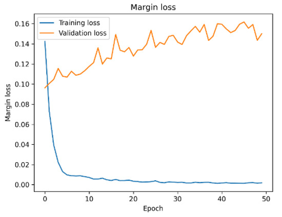 From the above table, it can be seen that the SA-CapsNet model performed well on the different datasets, recording an accuracy of over 75%, while it achieved an accuracy of over 80% on both the IMDB and MPQA datasets. Taking the IMDB dataset as an example, the model’s accuracy and margin loss are shown in Figure 10 and Figure 11.