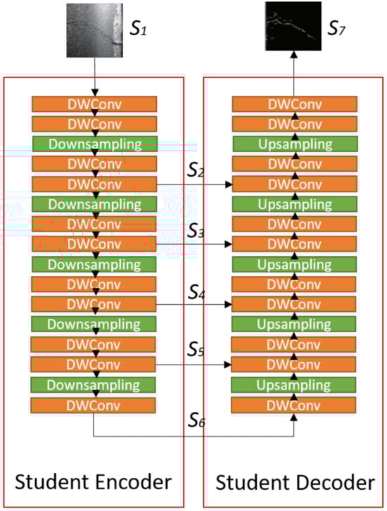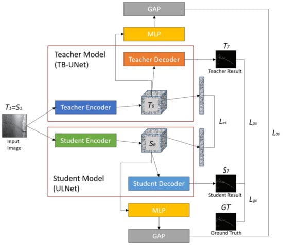 - Knowledge distilling is used to transfer the crack knowledge learned by the teacher model to the student model. Here, our teacher model is a complex and accurate model, while the student model is a simplified light-weighted model. Knowledge distilling can effectively supplement the ability of student models to extract high-level features, reducing model complexity while maintaining good performance.