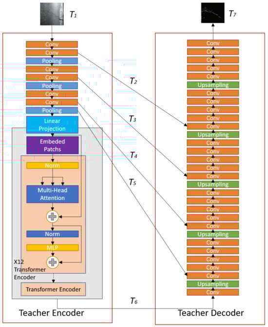 Secondly, in order to get higher accuracy for crack segmentation, a transformer-based UNet with extremely large model size (TBUNet) is designed. As shown in Figure 1, in the teacher model, 12 transformer [15] encoder modules are stacked together to form a large crack feature encoder for high-level feature extraction. These transformer encoder modules use self-attention mechanisms to achieve feature encoding and feature representation, which can capture dependency relationships between different positions in feature maps and achieve contextual awareness. Note that that the TBUNet has been pre-trained using the crack dataset, and its pre-trained weights are used to teach the student model.