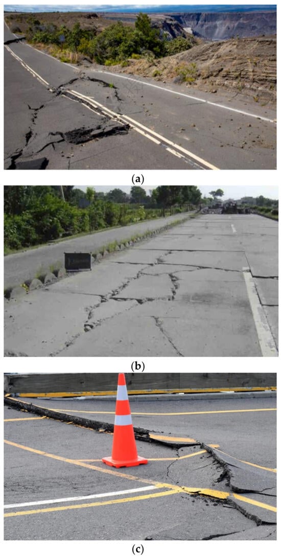 Crack images in the MICrack dataset. (a) Crack with interference from road lines. (b) Bent cracks. (c) Crack which has curled and warped.