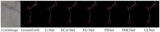 Here, a comparison of the prediction results is shown in Figure 5. The differences in the red box indicate that our model performs well in predicting crack details, and the crack segmentation results predicted by our model are very consistent, indicating the effectiveness of our model.