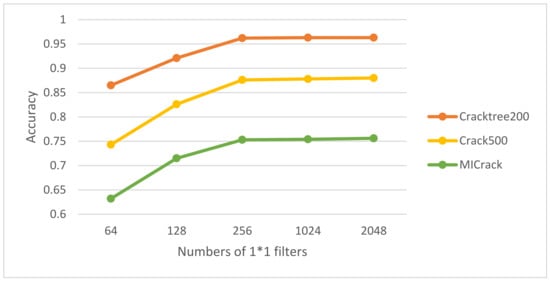 In order to explore smaller semantic segmentation models and balance the relationship between accuracy and model size, an experiment was designed to test the accuracy of the ULNet by adjusting the number of 1 ∗ 1 channel filters in the DWConv in ULNet.