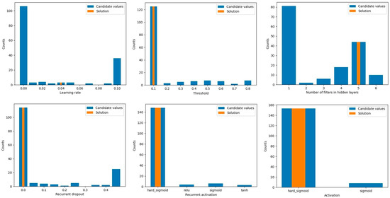 The candidate values belong to the set of values of the defined range for each required parameter by the FOX metaheuristic algorithm given in the column Range/Values, Table 1. In the cases of a continuous domain search by searching for decimal values, for better visibility of the graphics, rounding was performed to 0.1, 0.05, and 0.01 for Threshold, Recurrent Dropout, and Learning Rate, respectively. The Solution represents the optimal value for each parameter individually according to the FOX metaheuristic algorithm, and these values are given in the Optimal solution column, Table 1.