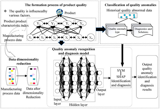 General models for the identification and diagnosis of quality anomalies have inherent flaws that make them less accurate and less efficient. Figure 1 illustrates the general methodology for identifying and diagnosing manufacturing process quality anomalies. The formation process of product quality in the figure demonstrates that complex product quality influences numerous factors. Based on historical data, the quality anomaly pattern is not comprehensive, resulting in the emergence of new quality anomalies. This can lead to an inability to identify these anomalies in a timely and effective manner. The classification of quality anomalies process in the figure illustrates that quality anomalies are typically divided into several types. However, this classification introduces increased complexity to the model. The data dimensionality reduction process, while downgrading the quality features, also results in the loss of some of the features, which affects the accuracy of the identification. In the diagnosis of the causes of quality anomalies, a general solution is typically provided for a class of problems but not for each sample. This results in the inability to quickly carry out the processing of the quality problem, which affects the progress of the production of the product.