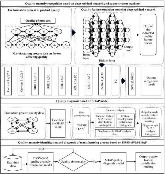 According to the aforementioned research, it is imperative to ascertain the present quality status within the product manufacturing process, establish whether the current product quality is atypical, and diagnose the cause of the anomaly expediently and precisely. However, the real-time performance of identifying and diagnosing quality anomalies in the manufacturing process of complex products needs improvement due to the high dimension of quality characteristics, high coupling, and noise of quality-related data. The performance of a neural network model is closely related to the model’s complexity, and if the model is too complex, it has good performance but is not conducive to deployment on hardware or online applications [17]. Therefore, this paper addresses the issue of quality anomaly identification and diagnosis in the manufacturing process of complex products. After examining various indexes of quality characteristics and accounting for significant noise levels, a method is proposed for identifying quality anomalies that employs self-learning neural networks and support vector machines. The SHAP technique is then utilized to perform a diagnosis on the root cause of each anomalous quality sample. First, the depth of the residual neural network is utilized to enhance noise reduction and increase self-learning capabilities for data mining of redundant data. From extensive historical data analysis, the primary characteristics associated with identifying abnormal quality are identified. Secondly, the deep residual network’s extracted features are utilized as input for identifying quality anomalies through the support vector machine’s excellent binary classification performance. A quality diagnosis model based on SHAP was developed to identify the root cause of abnormal quality by assessing the degree of the contribution of quality characteristics. The model was then tested using an example.