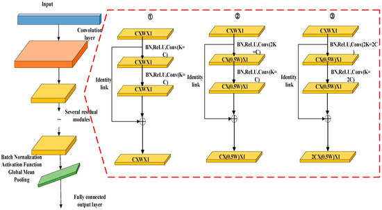 Here, the cuboid represents the feature map with C channels, W width, and 1 height, and K represents the number of convolution kernels in the convolution layer (K = C means that the number of convolution kernels is the same as the number of channels of the input feature). ① indicates that the size of the input feature map is equal to the size of the output feature map. ② means that the width of the output feature map is halved. ③ means that the width of the output feature map is halved and the number of channels is doubled.