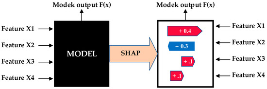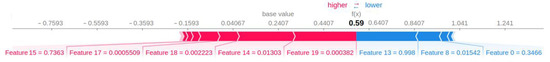 By analyzing the input of a single sample using SHAP, we can determine the contribution value of each characteristic towards the recognition result. The outcomes are presented in Figure 11, where red highlights the features that lead to a positive recognition result and blue indicates those that lead to a negative result. The values of the feature are represented by the numbers below the bar. The wider the color area of the bar chart, the greater the feature’s influence. If the f(x) value is less than 0.5, the instance’s identification result is unqualified, and vice versa. The single-sample SHAP analysis of samples 257 and 1290 was conducted as described below.