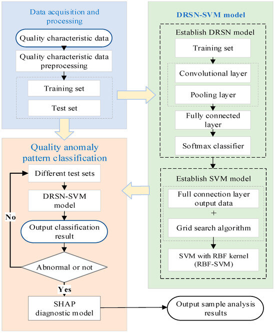 The abnormal identification of complex product manufacturing quality and the diagnosis process based on DRSN-SVM-SHAP are shown in Figure 6.