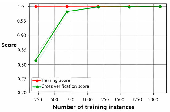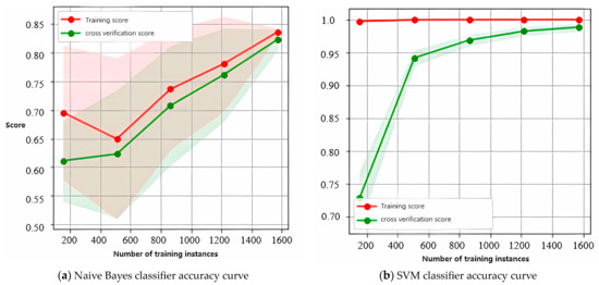 The training set data is brought into the deep residual shrinkage network for feature extraction, and the extracted features are input into the support vector machine model for classification. Figure 7 shows the learning curve of the manufacturing quality anomaly recognition model of complex products based on the DRSN-SVM model. The learning curve for quality anomaly identification using the naive Bayes classifier and the SVM classifier is shown in Figure 8. In Figure 7 and Figure 8, the red and green dots and lines indicate the training score and cross-validation score, respectively, which represent the performance of the model on the training and test sets. And, the light red and light green regions indicate the range of variation of the model’s cross-validation scores for different numbers of training instances, respectively. The light red and light green regions decrease, indicating that the model’s performance becomes more stable.
