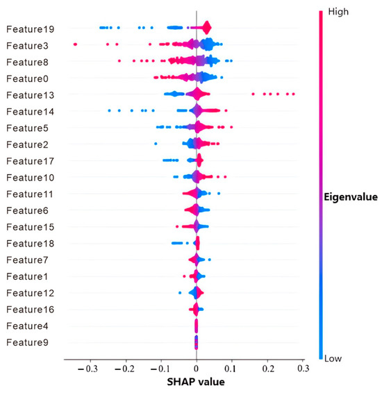 Combining features and the importance of the recognition results effect, the data collection of all the characteristics of each sample value displayed shapes drawn into a scatterplot, as shown in Figure 9. The Y-axis represents the feature names of the dataset and is sorted by feature importance. The X-axis shows the SHAP value of each feature, which is the impact of the feature on the prediction. The characteristics of the identification results are coded by color, where red represents recognition results that are relevant, and blue represents results that are negatively related to the identification results. For each sample, if the combination result is greater than 0.5, the discriminant for the product is qualified, unqualified, and vice. The jitter of the same feature in the Y-axis direction represents the SHAP value distribution of the feature in the entire dataset, and the wider the regional distribution is, the more influential the feature is. Due to the large number of features, only the top 20 features that affect the recognition results are selected for display.