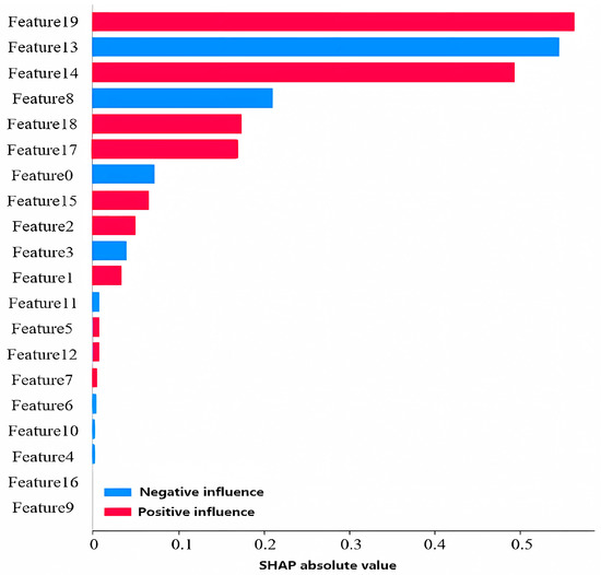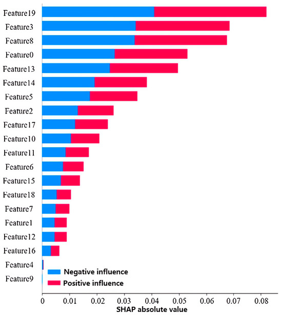 Figure 9 demonstrates that feature 19 holds the most significant sway on recognition results, closely pursued by feature 3 and feature 8. Conversely, feature 4 and feature 9 possess a negligibly minor influence on model outcomes. Nonetheless, the image alone is insufficient to indicate the characteristics’ overall impact on the model’s magnitude, given the importance of distribution properties. The color indicates the direction of influence that each feature has on the recognition result, with importance ranked accordingly. Figure 10 displays a bar chart that clearly demonstrates the average impact of each feature on the model’s output. This enables us to assess the significance of each feature and make more informed decisions.