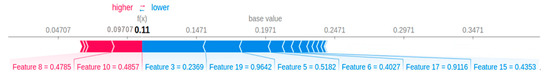 As depicted in Figure 11, sample 257’s model output value is 0.11, resulting in an unqualified classification. The main contributor to identifying this sample as an anomaly was feature 3, followed by feature 19 and feature 5. Therefore, it is possible to diagnose the result, and the abnormality cause of this sample is linked to feature 3, feature 9, and feature 5.