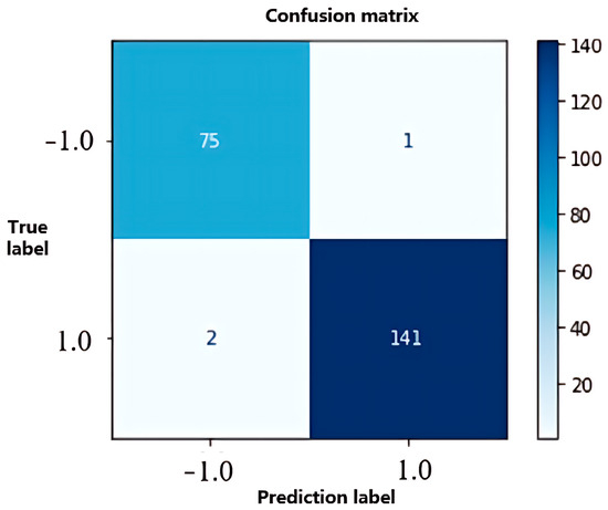 The DRSN-SVM quality anomaly recognition model was evaluated using the confusion matrix and ROC curve. The test set data was brought into the model for testing, and the resulting confusion matrix is displayed in Figure 14. It is evident that 142 out of 143 positive cases were correctly classified, along with 75 out of 76 negative cases, resulting in TP = 141, TN = 75, FN = 2, and FP = 1. Further calculations yield model = 0.99, = 0.986, = 0.993, and = 0.979, MCC = 0.97 indicating satisfactory classification performance of the model.