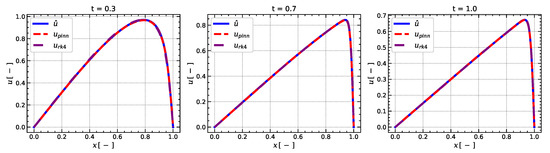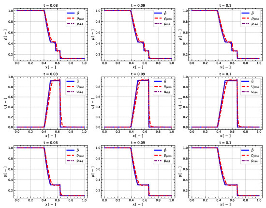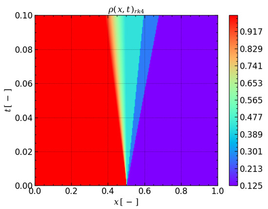 The significance of these plots lies in their ability to demonstrate the accuracy of the numerical methods in capturing the complex behavior of compressible flows. It can be seen that the RK4 model has some oscillations in velocity u and pressure p profiles, while the PINN model is more smooth. The norms were computed at time . Given that norms for the PINN and CFD models for the velocity u are 0.1633 and 0.4472 and 0.0261 and 0.1213 for the pressure p, the PINN model significantly outperformed the CFD model by 170 % for the velocity u and by 360 % for the pressure p relatively, which is the main advantage of the PINN model.