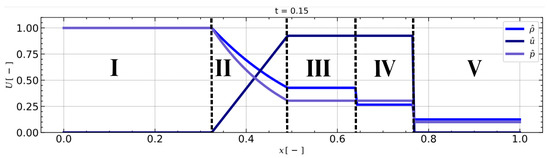 Regions I and V show values of the physical quantities that are the same as the initial conditions. Region II denotes the position where the head and tail of the rarefaction wave move leftward. While the solution remains continuous within this region, certain derivatives of the fluid quantities might not exhibit continuity. Region III shows the element position of the fluid that is initially at interface point reached at time . The right end points of Region III and Region IV are called a contact discontinuity. It is observed that the pressure and the normal component of velocity remain continuous across the contact discontinuity. However, the density is not continuous across a contact discontinuity. The end point of Region IV is the location of the shock wave moving to the right. During the shock, all of the quantities will in general be discontinuous.