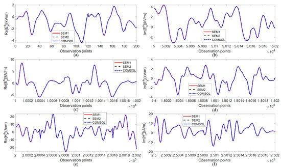 Due to the inherent limitations of traditional SEM or COMSOL in directly calculating the scattered field, a two-step approach is required for comparing the scattering fields: first, by directly computing the total field; and second, by substituting the scatterer with a background medium to determine the incident field. Consequently, the scattered field can be obtained as the difference between the total field and the incident field. The comparison of the scattered fields inside the scatterer for two different SEM methods and COMSOL is illustrated in Figure 3, where “SEM 1” denotes the proposed method, and “SEM 2” represents the conventional SEM. The x-axis represents randomly selected observation points, which are part of a total of 288,000 observation points. It is evident from Figure 3 that both methods yield highly consistent results. Additionally, the unrepresented components (Ez, Hx, and Hy) demonstrate an equivalent level of accuracy. The discrepancy between the different methods is further quantified by calculating the L2-norm errors, which are given by the following equation: