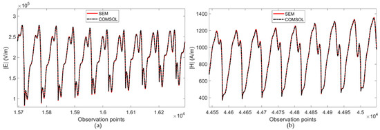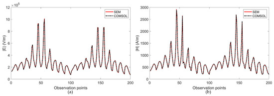 The comparison of the scattered field strength at observation points external to the scatterer for SEM and COMSOL: (a) the comparison of the electric field strength; (b) the comparison of the magnetic field strength.