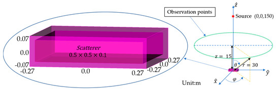 The present case investigates a model in a half-space, as illustrated in Figure 4. The upper half-space represents the air, while the lower half-space represents the ground. The scatterer with the dimensions of 0.06 m × 0.06 m × 0.02 m is positioned on the ground surface and centered at the origin. The model in Figure 4a (named model A) has a computational domain size of 0.12 m × 0.12 m × 0.08 m, where the ground height is set to 0.05 m, and the underground depth is set to be 0.03 m. Given its inclusion of excitation sources within the computational domain, this model is well-suited for COMSOL, and, in the actual simulation, a perfectly matched layer with a 0.015 m thickness is attached to the outer surface of this computational domain as the boundary condition. The model in Figure 4b (named model B), however, does not incorporate an excitation source within its computational domain of a 0.07 m × 0.07 m × 0.03 m size and, thus, possesses slightly larger dimensions than the scatterer. Both the ground height and the underground depth are reduced to 0.025 m and 0.005 m, respectively. Also, it suits the method proposed in this paper. The electromagnetic parameters of the background medium are , , and and , , and , and the electromagnetic parameters of the scatterer are , , and .