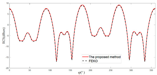 The comparison between the calculation of the proposed method and the FEKO result is shown in Figure 8, where logarithmic expressions are used to facilitate the intuitive display of the RCS results at each point. The figure highlights that the RCS calculation method proposed in this paper matches FEKO’s results, indicating that this method can accurately calculate the RCS of target scatterers. The error is further quantified by Equation (10), where R represents the RCS value, subscripts A and B represent FEKO and the proposed method, respectively, and the L2-norm error resulting from the two methods of calculation is 3.7%. The error is slightly larger compared to the first two cases, which may be due to the fact that the FEKO calculation method in this model is based on the integral equation method. The accuracy and stability of the numerical integration may be slightly affected when dealing with scattering problems with a high contrast. Nevertheless, the results still show a very high accuracy. This better illustrates that the method presented in this paper effectively addresses the issue of high-contrast scattering while maintaining a high level of accuracy.