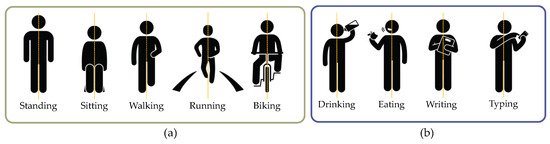 Previous studies have classified human actions into two categories: simple human activities (SHA) and complex human activities (CHA) [11,12,13]. According to Shoaib et al. [13], SHAs are repetitive, regular movements such as walking, running, sitting, and standing that can be easily recognized with an accelerometer. On the other hand, CHAs are not as repeated and often include actions associated with the hands, such as eating, smoking, and drinking [11]. Recognizing these actions may require using other sensory modalities, such as a gyroscope. Actions that include stairs have also been categorized as CHAs because of the challenge of accurately identifying them alone via an accelerometer [13]. Alo et al. [14] distinguished short-duration activities, such as walking and jogging, and longer-duration activities, such as cooking or taking medicine, which entail a series of sub-activities. Peng et al. [12] defined SHAs as repetitive movements or individual body positions that, while easier to identify, do not accurately represent typical human activities in everyday life. The complication of real-world activities, including many SHAs, temporal evolution, and high-level interpretations, is best encapsulated by CHAs. Liu et al. [15] defined atomic actions as indivisible unit activities, meaning they cannot be broken down any further. On the other hand, complex activities consist of a series of atomic movements performed in different combinations, either sequentially or simultaneously. Correspondingly, Chen et al. [16] conducted a comparison between single and repetitive SHAs, which can be identified using an accelerometer and CHAs. CHAs involve multiple overlapping activities and often require the utilization of multimodal sensors. Ultimately, Lara and Labrador [11] presented a review that condensed taxonomies of human activities, categorized according to the distinction between primary and complicated motions, as previously defined in existing research.