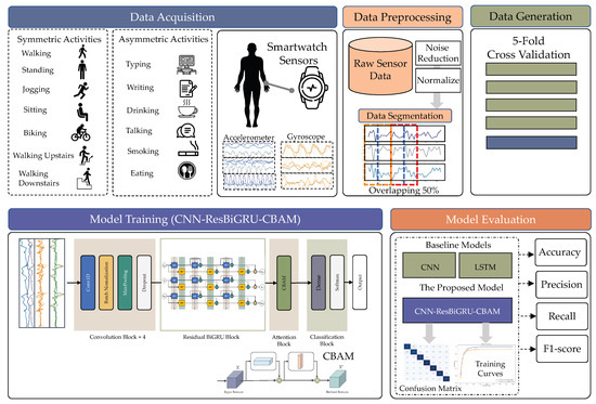Additionally, we introduce a hybrid residual deep learning model termed CNN-ResBiGRU-CBAM. Performance evaluation metrics such as accuracy, precision, recall, and F1-score are employed to assess these models. Figure 2 illustrates the sequential steps of the proposed sensor-based HAR framework.