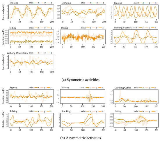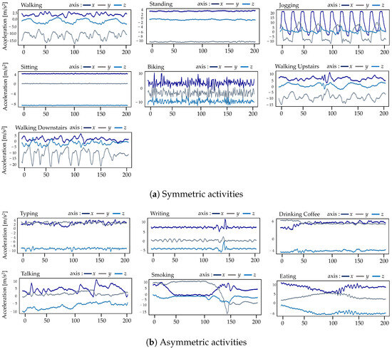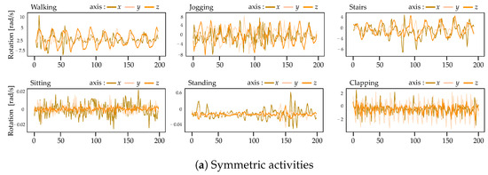 - Symmetric activities entail the coordinated use of both sides of the body in a mirrored fashion, as depicted in Figure 1a. Common symmetric activities recognized by sensor-based HAR systems include walking, running, climbing stairs, biking, and similar motions.