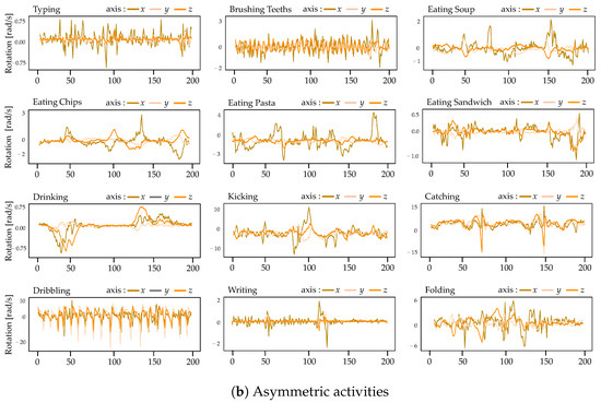 Conversely, the samples of asymmetric activities (Figure 3b and Figure 4b) exhibit a notably higher degree of visual diversity, lacking distinct patterns of repetition. This encompasses sporadic and asymmetrical hand movements during eating, gesturing while brushing, and irregular rotations while handling objects, such as during writing. The fluctuations in accelerations and orientation alterations observed in these intricate activities stem from their spatial and temporal asymmetry.