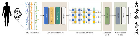 The suggested model comprises three main elements: convolution, residual BiGRU, and CBAM blocks. It represents an end-to-end deep learning framework, functioning as a hybrid architecture. The overall layout of the proposed model is depicted in Figure 8.