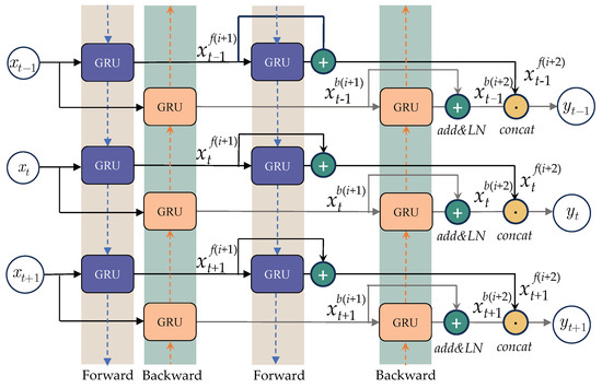 Layer normalization () denotes the normalization of layers. At the same time, the processing of input states in the GRU network are represented by G. The t-th moment in the time series is denoted by the subscript t in . The forward state is indicated by the superscript f, the reverse state by b, and the number of stacked layers by (). The encoded information at time t is generated by amalgamating the forward and backward states.