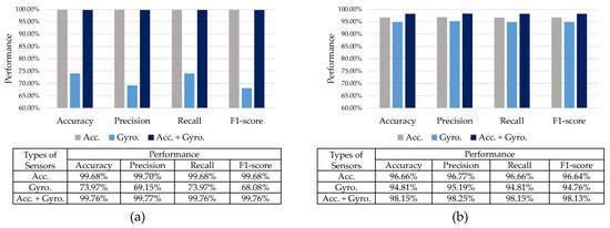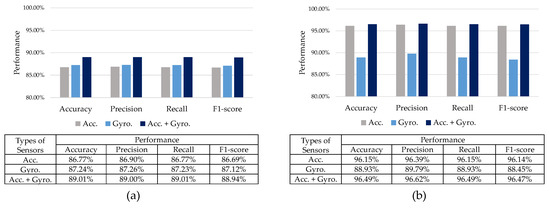 Comparison results of the proposed CNN-ResBiGRU-CBAM using data from different types of sensors: (a) WISDM-HARB dataset; (b) UTwente dataset.