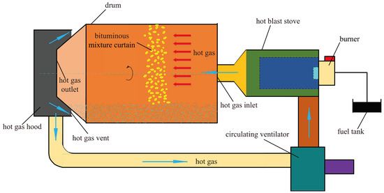 The principle of HDH for bituminous mixtures is shown in Figure 1. Hot gas, which is formed in a hot blast stove with the fuel burning in the burner, flows into the bituminous mixture heating drum. A bituminous-mixture curtain is formed in the drum under the action of a rotating drum and blade, and the bituminous mixture is heated via full contact with a hot gas. The temperature of the hot gas decreases after heat exchange with the bituminous mixture but is still dramatically higher than room temperature. To reduce fuel consumption, most of the hot gas flows into the hot blast stove through a circulating ventilator and is then reheated. The reheated hot gas enters the heating drum, and the bituminous mixture is heated again. A small amount of the hot gas is discharged through the gap between the hot-gas hood and the drum. This cycle is continued until the temperature of the bituminous mixture reaches 160 °C, which is appropriate for construction purposes.